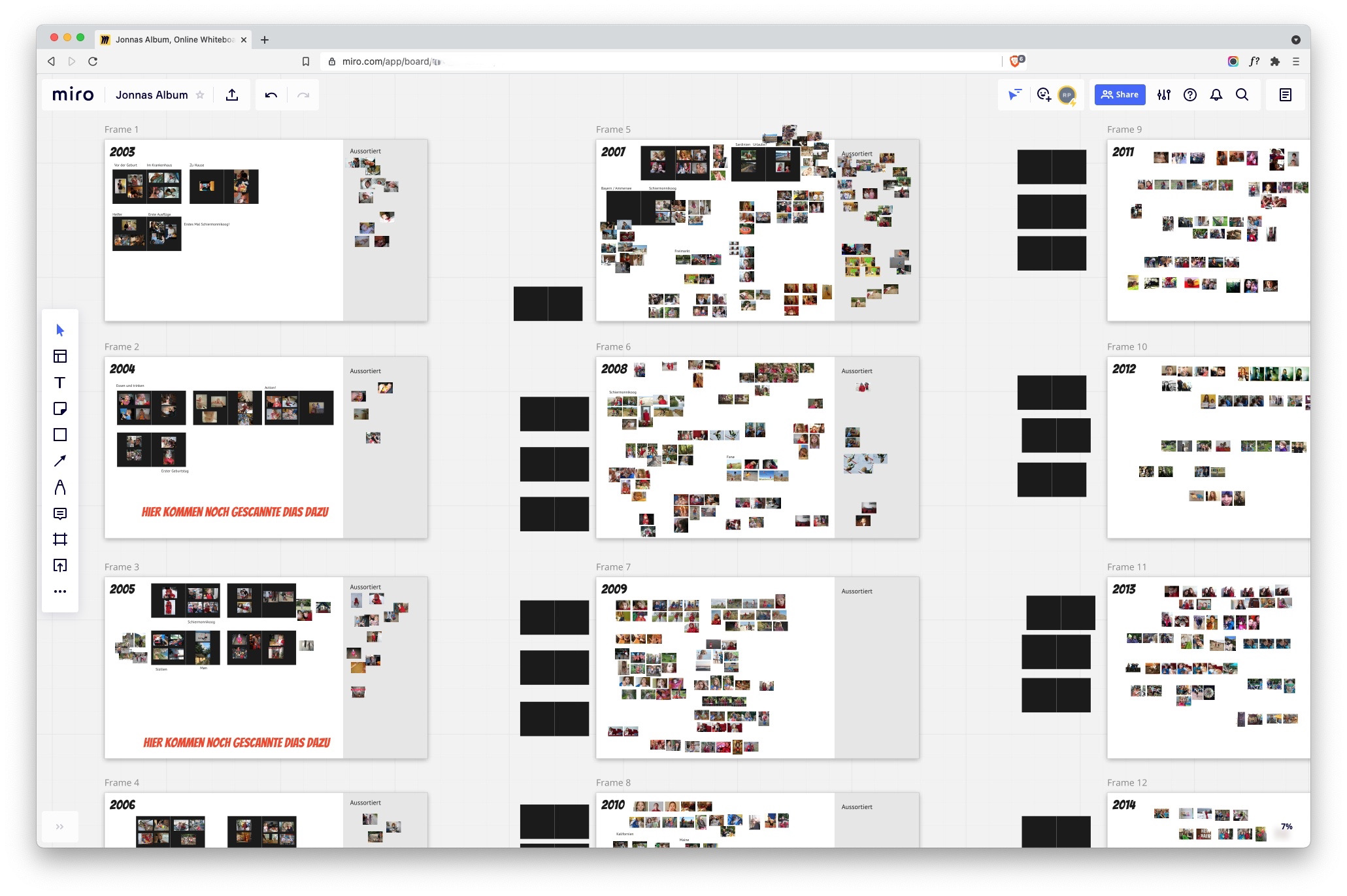 How could I make Miro handle 900 images in one document? I feared that full resolution versions would slow the app to a halt—even uploading that amount of data would take too much time. But full res photos weren’t needed—they just had to be good enough to recognise their content. So in the Photos app I set up several intelligent albums that held a year’s photos and exported small versions of them (about 20 KB each) that I then, year by year, dropped them onto artboards (called »frames« there) in Miro.